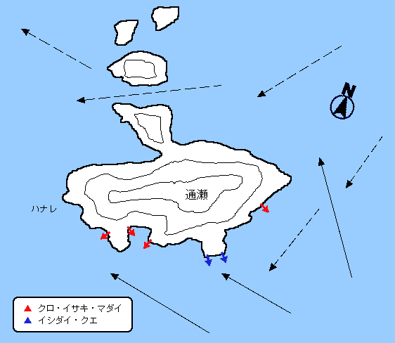 上げ下げともに潮が速く水深は浅い。冬から秋が良くクロは40センチ前後の数釣りが楽しめる。
