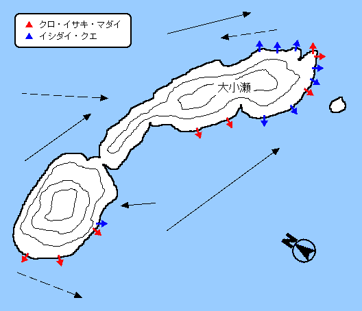 11月は35センチの数釣りで冬になるにつれて型がそろうようになる。沖の潮にのせて攻めると40センチ前後の数釣りが楽しめる。西側先端では上げ潮を流しカゴでイサキ、真鯛は冬から秋が大型が出やすい。