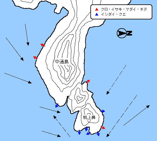 潮は沖合いを流れる本流が早いため不安定になりやすい。沖目の上潮を流しカゴでイサキ、真鯛は冬から秋が大型が出やすい。クロは型があまりよくない。