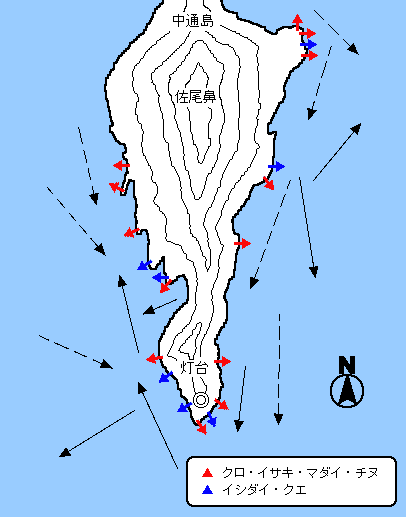 沖の潮に乗せてカゴで流すと大型ヒラマサも良く当たる、秋の夜釣りでは下げ潮を流しカゴでイサキ、真鯛は冬から秋が大型が出やすい。(南側)