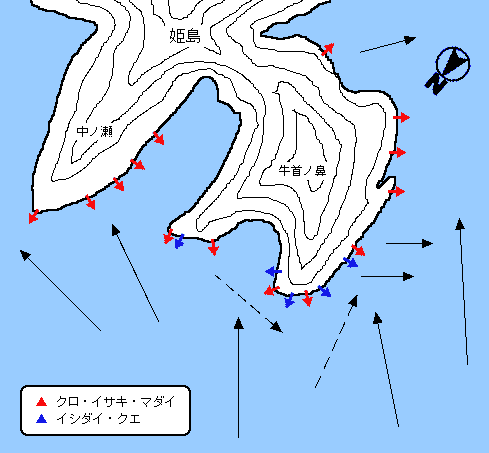秋冬は季節風に弱いため上礁が非常に困難。しかしクロ、チヌの魚影は非常に濃く沖へ払いです潮に乗せてるれば釣果は期待できる。
