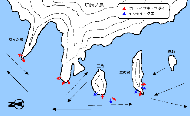 潮とうしが良く沈み瀬が多いのでクロ釣りでは人気の高い釣り場である。冬場のクロの魚影は非常に濃く40センチ前後の数つりが期待できる。