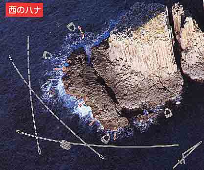 その名の通り上阿値賀島の西端み位置する。足場も極めてよく、対象魚もクロ、チヌ、イサキ、マダイなど上物全般のわたり、人気・実績ともに高いA級釣場である。マダイは過去の何度も大物が仕留められているし、クロも数こそさほど期待できないものの、冬場には良型が出ることで定評がある。 潮流は複雑で、その日そのときで沖に立ったり、横流れだったりするが、潮通しという点では上げ下げともに抜群によく、ときには非常に速い潮が流れることもある。 釣場が広いので竿出し地点に迷うかもしれないが、一番いいのはA点、およびB点で、クロ、イサキ、マダイの実績が高い。マダイは下げ潮に分があり、しかも沖に立つ潮なら大型の一発が期待できる。マダイはカゴ仕掛けで狙う人が多いが、A点からはウキ下竿二本くらいのフカセでも十分狙える。クロは上げ潮に分があり、竿一本先くらいからウキ下二ヒロで流す。 C、D点ともクロ、イサキ、マダイが出る。C点前方には沈み瀬があり、その周りは狙い目。また、D点は足元から根が出ているので、取り込みの際には注意が必要である。 グンカン′きを釣るE点はチヌのポイントで、大型が出る。なお、北、北西、西の風のときは上礁できない。 |