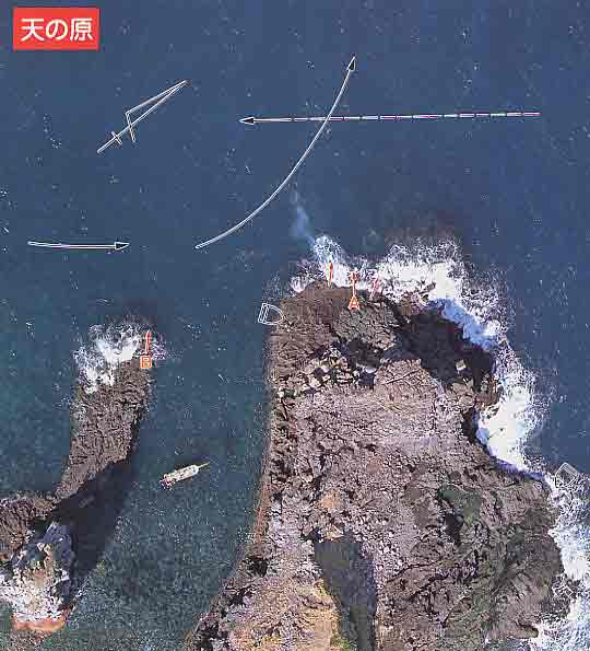 本島北岸に位置する地磯。右沖に”北の平瀬”を見る。かつては地元の釣り人のチヌ釣り場だったところで、乗っ込みチヌは例年ここから釣れ出す。釣場が広く、逃げ場もあり、北、北西の風でも強風でない限り竿だしできる強みがある。対象魚は春のチヌ、秋から春にかけてのチヌ、それに周年狙えるマダイなど。 潮は上げ下げやれるが、どちらかといえば左から押してくる上げ潮に分があり、これが瀬に当たって沖にはねるときがよい。A点足元からの流し釣りでクロ、チヌ。竿二本くらい先に投げて潮目を狙うとマダイが出る。シーズンには600〜800g級のクロの数釣りができる。マダイはデカバンはあまり出ないが、5〜6kg級の実績はある。チヌは船付け点周辺を狙っても面白い。 B点からも竿出しできるが、左手に根の張り出しがあるので、遠投の必要がある。また、船付け点から右手に回り込んだところからも竿出しできる。 |