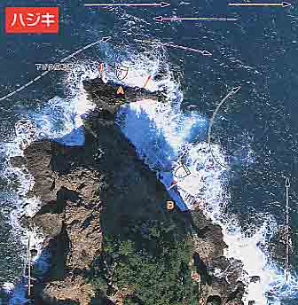本島北東岸に位置する地磯。底根が粗く、沈み瀬も多いだけにクロの魚影の濃いところ。その他、チヌ、マダイ、イサキも出る。クロは秋から冬にかけて賀置くによく、500〜800g級を主体にキロ級まで望める。 A点は上げ潮が有利。潮が引けば視認できる沈み瀬が二つ連続してあるのでウキ下ニヒロ半でやや遠投してこの沈み瀬の際を流すと、良型クロ、大型チヌが食ってくる。また、マダイも上げ潮の方がよく、ウキ下竿二本で遠投する。主体は4〜5kg級。ただし、沈み瀬があるので糸フケの出し過ぎや取り込みの際には注意が必要である。下げ潮も舞い込んで右に流れるときはクロ、チヌ、マダイがよく当たる。足場は悪く、右手はカケアガリ状で波が這い上がりやすいので注意が必要である。竿出しは二人までが釣りやすい。 B点は時化気味の時の船着け点で、A点の予備的な釣座であるが、沖に払い出す潮があるときは狙い目も十分で、クロがよく食ってくる。型は400〜600g級が主体。右手の沈み瀬の際を縫うように流すとよい。ウキ下はニヒロ半から三ヒロ。足場はよい。竿出しは二人。A〜B間は移動できるが、潮が満ちてくると通りくなる。 北東、東の風では上礁できない。また、北西は化座裏になるが、風が強いと船が着けにくい。 |