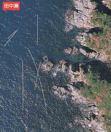 本当の南岸に位置する小さな独立礁。別名”千鳥のハナレ”ともいう。釣座が低く、荷物を置くスペースもあまりないほどで、通常はほとんど見向きもされないところだが、冬季のクロ釣りには定評があり、400〜500g級の数釣りを楽しむことができる。ここを専門に狙う常連もいる。 釣座右手に沈み根があり、上げ潮がこれに沿って左沖に出ていくときがチャンス。左沖にも沈み瀬があり、その周辺で良くヒットする。竿一本くらい沖に投げて反復釣りを心がけると良い。そう沖まで流す必要はない。ウキ下はニピロ〜ニピロ半。 左から右沖に流れる下げ潮の場合は、潮目を追う釣り方で釣果が上がる。ポイントは沖目であることが多い。下げ潮のほうが速い。また、下げ潮なら夜釣りでマダイが食う可能性がある。 12月から3月にかけては北磯に負けないくらいの釣果が上がるが、当たりが小さいので感度重視の仕掛けで臨み、前当たりを見逃さないようにしたい。なお、西、および南からのウネリには十分な注意が必要である。 |