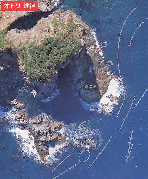 本島西岸の地磯。釣座が低く、波を被りやすいが、クロ、チヌ、マダイ、イサキの良型が出る。 A点は上げ下げやれるが、クロは上げ潮に分がある。左手から押してくる潮がいったん瀬に当たり、右に出て行くときがチャンス。足元に沈み瀬があり、その周りや沖で潮がカーブする地点でよくヒットする。シーズンにはキロ級を含めて良型が多い。チヌもこの潮で出る。春と秋に大型の実績が高い。マキエは足元、ウキ下はニヒロ半。また、ここは夜釣りのイサキもフカセでよくあたり、とりわけ落ちイサキの好ポイント。二人までの釣座。 B、C点もA点同様でよく、本流に引かれる潮に乗せて本流との合流点を攻める。ただし、釣座が特に低いので、うねりがあるときは注意が必要である。ここも二人まで。 マダイはA、B、C点もウキ下竿一本半〜二本で上げ潮に乗せて釣る。下げ潮は遠投して沖を釣る。 D点は時化たときの船着け点で、通常はほとんど釣る人のいないところだが、沖に出る潮があるときは狙い目となる隠れたポイント。とりわけ時化気味のときがチャンスで、瀬際でクロ、払い出しに乗せて沖を流すとチヌが出る。クロは400gからキロ急まで望め、過去には1.5kgの実績もある。ただし、横流れの潮は食わない。 ”オドリ”の右手に位置する地磯。足場はこちらのほうがよい。対象魚は秋から春に掛けてのクロ、夏のイサキ、マダイ、春と秋のチヌなど。チヌは”オドリ”同様大型の実績が高い。 E点は寒グロの好ポイントでキロ級も出る。左前方の沈み瀬周りが狙い目で、上げ潮が反転して巻き込み潮となるときがチャンス。竿二本〜三本先で食ってくる。下げ潮は沖目を走るので釣りづらい。 F点は上げ下げやれるが、足元がカケ上がり状で波が這い上がりやすい。上げはワンドの中を釣り、下げは沖目を釣る。マダイ、イサキは竿一本半〜二本半でやや遠投する。E、F点で三人まで。 |
