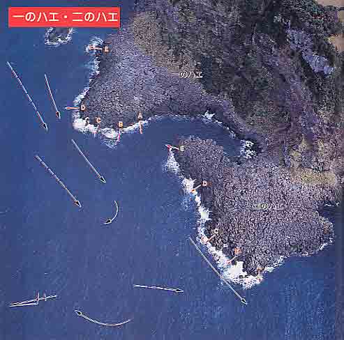 ここも”一のハエ”同様上げ潮の実績の高い釣場。潮廻りは、旧暦の12日〜18日くらいの中潮から大潮にかけてが特によい。沖の上げ潮によってできる大きな反転流が、瀬渕を速い潮となって西へ流れることが多く、この潮でクロ、チヌ、マダイ、イサキがよく当たる。クロはウキ下ニピロ〜四ヒロ。中型の数釣りもできるし、冬季にはキロ超級もよく出る。チヌは春がよく、イサキは4月下旬から7月下旬にかけてがねらい頃。 E点は時化気味の日にクロがよくヒットする。ワンドの中がサラシているときがチャンス。チヌも出る。 夜釣りはウキ下竿一本半から二本くらいで流すが、遠投ができるならば、40〜50mくらい先の右へ流れる沖潮に乗り、釣果は俄然良くなる。その場合のウキ下は竿二本半から三本と深く釣る。 A点の左手”三のハエ”とのワンドは死に瀬になることが多いが、波立てばチヌが出る。なお、三のハエは危険度が高く、上礁禁止である。 |