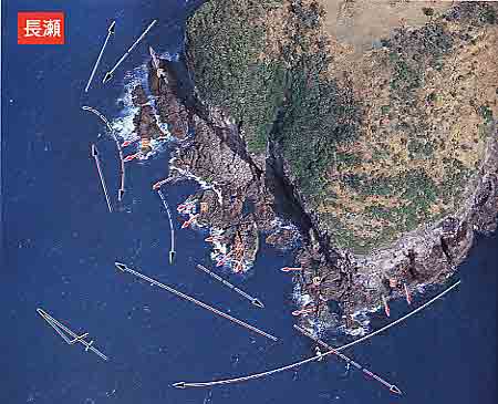 本島西端の断崖下に連なる本島きっての好釣り場。周辺は根や沈み瀬が複雑に入り組んでおり、潮の通しも良く、魚影は抜群に濃い。それゆえ、対象魚もクロ、チヌ、マダイ、イサキ、青物、スズキなど多岐にわたり、良型、大型の実績が非常に高い。 ただし、北、北西、西の風波に弱く、逃げ場もないので冬季は上礁できる日が限られる。 潮は速く、上げ下げ釣ることができる。ただ実績としては下げ潮のほうが高い。上げ潮はE点左側のワンドから沖にでることが多くて狙いづらいが、時間とともに角度が変わり、瀬の前を流れるようになるので、そのときは狙い目も十分である。 A点はチヌ、クロが良く、C点との間にある小さなワンドを巡って沖にでる潮で釣果があがる。チヌは大型が多く、春には数もでる。クロもキロ級が良くヒットする。マダイ、イサキはカゴ遠投で潮目を釣る。マダイはデカバンの実績が高い。三人から四人は竿だしできる。 B点は”とんがり”とも言う。ハナレだが、潮が引けば渡る事ができる。三人までの釣座。前に沈み根が二つ張り出しており、その周りが絶好の狙い目。足下から流す反復釣りがよい。 C、D点はA、B点にやや劣るが、チヌ、クロがよい。E、F点はしけたときの予備的な釣座。 |