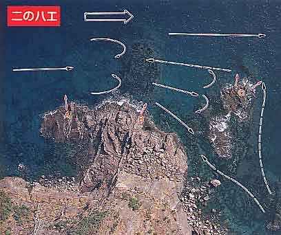 右方に三のハエ、左手に二のハエがあり、その二者と同じく上げ潮の本流は川のように流れる。そのため本流釣りを余儀なくされるが、Bの前の沈み瀬、及びCのハナレが非常にジャマな存在となる。 つまりAから流そうとすればBの前の沈み瀬の手前までと範囲が限られ、Bからやろうとすると、沈み瀬を越した瀬がハナレに到着するまでの間しかない。逆にそれだけ釣りづらいから場荒れが少なく、まだまだ魚が多いのかも知れない。 具体的にその攻略法を記すと、Aはマキエ、仕掛けとも左方の潮上に目一杯遠投する。潮が遠いから目の前であれたところで仕掛けはなじむ。そこから沈み瀬の手前までが勝負で、これを何度も繰り返す。ウキ下は二.五ヒロで、ハリスを等分する位置に小さめのガン玉を一個、または二個打つ。クロは型は平均300〜400g、大きく700〜800g。 Bから竿をだすのは佐賀勢が多い。彼らの釣り方というのはウキ下を1〜1.5mと浅くとり、沈み瀬とハナレの間を何度も流すという方法。それでチヌもクロも上がっている。Cのハナレは三のハエと同様、凪日の大潮干潮時しか上がれない。 なお、Aは満潮になると大半が波を被る。潮は横に流れるので一人、もしくは二人までしか竿は出せない。 下げ潮上げ潮よりゆったり流れ、瀬渡船長にいわせればそちらの方がよく釣れるそうだが、自分自身下げ潮で釣れた記憶はない。 |