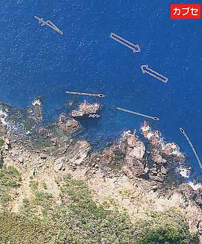 長手のハナの南≠ニいう釣人が多く、高島カブセという通称はあまり普及していない。人気も低く、ここを希望する釣人は非常に少ない。 Aは足場が低く、潮が満ちてくれば波を被るから干潮前後の釣場といえる。B、Cはその点、足場が高いので釣りやすい。 潮は上げで右、下げは左に本流が走るが、瀬の近くは本流に引かれて沖へ出る潮と、瀬際を追うように流れる二種類の潮が生じる。カブセではこの瀬際を流れる潮を釣る。いわゆる瀬際釣りという攻め方で、一.五ヒロのタナを取り瀬際50cm以内を探るとクロが出る。そのためA、B、Cで合計三人まで。それ以上釣人が多いと釣りにならない。 チヌ狙いに7〜8sのマダイが食った実績もある。 Dはそこが見えるほど浅いが、シケてサラシができたときは好ポイントに変身する。高島の本島を伝って移動できるから、天候が急変しても逃げ場はある。 |