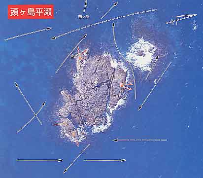 頭ヶ島の東側にぽつんと浮かぶ独立礁。その名の通り極めて低く、平らな瀬なので、上礁に際しては十分な注意が必要である。また、いつも波が釣座を洗っており、滑りやすいので、足元にも注意が必要。 対象魚はクロ、チヌ、マダイ、イサキなどで、いずれもシーズンには良型が食ってくる。ただ全体的に根が広がっているので、そのことを計算に入れてやり取りしないと、せっかく大物をかけてもなかなか取り込めない。 主な釣座はA〜D点の四か所。四〜五人は竿出しできる。A点は上げ下げ両潮狙えるところで、B点左の浅瀬を超えてきた潮と、頭ヶ島との水道を北上する本流とが合流し、正月カプセの方向に走る上げ潮を釣ると500〜800g級のクロがよくヒットする。夜釣りではマダイも出るが、前方に沈み瀬があるので取り込みがやや難しい。下げ潮はウキをやや深めにとっての沖目流しでクロ、チヌ、夜釣りでイサキが当たる。 B点は沖に向かって徐々に深くなっており、特にチヌがよいポイント。春だけではなく、初冬にも大型が出る。また、マダイ狙いもよい。 C点は足元から沈み根が張り出しており、沖にも沈み瀬が追帆崎に向かって流れるときが絶好の狙い目となる。30〜50mくらい沖まで流して釣るほうがクロにしろ、チヌにしろ一段と型がよい。また、下げ潮が釣座の前から右よりに流れを変えるときはチヌがよく、40mくらい先の潮がたるむところでヒットすることが多い。 D点は夜釣りのイサキ狙いが面白いところで、ウキ下竿二本くらいで上げ潮を釣る。 |