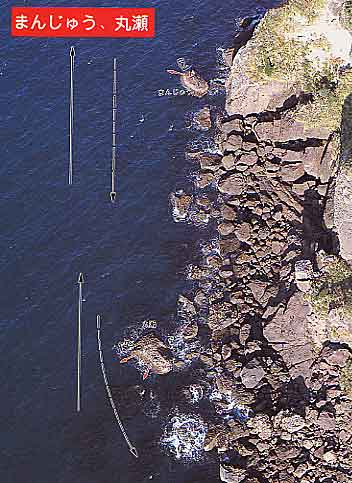 まんじゅう≠フ左手に浮かぶ小さなハナレ。ここも風波が弱く、上礁できる日が非常に少ない。周辺には沈み瀬が多く、沖には深みもあり、潮もよく通すことなどから魚影は抜群に濃い。特にクロはキロ級混じりの良型が多く、秋から冬にかけてのシーズンに上礁できれば、好釣り間違いなしといっても過言ではない好釣場である。
