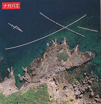 トヤク島の南側に位置する地磯。浅いので敬遠する人も多いが、常連釣師の中には好んで上礁する人もいるほどで、クロ、チヌ、イサキ、マダイの良型が出る。クロは足の裏級なら数釣れるし、冬場にはキロ級も期待できる。チヌも2sオーバーの実績がある。なお、イサキ、マダイはフカセでOK。 A、B、C点は上げ下げ遊色なく釣れる。いずれも速い水道流に引かれる潮で、クロ、チヌは竿一本〜二本半くらい先をウキ下一ヒロ〜二ヒロで狙うとよい。A点は瀬際の狙い目。マダイはウキ下竿一本くらいで沖目を釣る。 D、E点は上潮がよく、チヌ、イサキ、クロが出る。とりわけ春先のチヌには定評がある。足元が少しオーバーハングになっており、瀬際が狙い目。夜釣りのイサキも足元で出る。 北、北東の風に強いので、冬場にこそ攻めてみたい。全体に低く、大潮の満潮時には潮を被るので要注意。 |