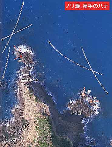高島の北側に位置する地磯で、左手に長手ハナ≠見る。北、西、北西風に弱く、冬場はなかなか上礁できないが、上がれば良型のクロが数狙える好釣場。その他、チヌ、マダイ、イサキなども大型、良型が期待できる。瀬が低いので、大潮時は足元に注意。竿出しは二人までが釣りやすい。 上げ下げ両潮やれるが、6対4の割合で上げ潮に分がある。下げ潮は速い流れが多い。また、本流の影響で上げ下げが逆に流れることもある。 A点は右手前方に沈み瀬があり、上げ潮なら竿二本くらい先に遠投して流す。クロはウキ下一ヒロ半〜二ヒロ。チヌは竿一本まで。下げ潮も若干沖目を流すほうが釣果はいいようだ。 B点もA点とほぼ同様の釣りかたでよいが、チヌ狙いなら左手の際はぜひ攻めてみたいところである。マダイはA、B点ともカゴ仕掛けで沖の潮目を攻める。大型の実績が高い。 |