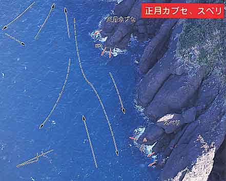 スベリ: クロの良型が期待できる好釣場だが、北向きで風波に非常に弱く、なかなか上礁できないのが難点。また、磯が海に向かって傾斜しているので荷物が置きにくく、足元にも注意が必要。潮が引けばA点の左手からも釣れるが、竿出しは二人が限界。 流れが非常に複雑で、潮目が沖にできたり手前にできたりするが、本命は左流れの下げ潮。押してくるような潮が瀬渕の根や沈み瀬をかすめて流れるときに型のいいクロやチヌが当たる。クロの型は平均600〜800g級で、ときにはオナガも出る。沖に出る潮もあるがウマズラが多く、あまり期待できない。 なお、磯が傾斜しているのでウネリが追い上がりやすく、夜釣りは危険。