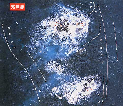 釣座は二つの分かれた岩に一名と四名、合計六名が適当。白い標識灯のある岩がポイント二ヶ所。上潮でAの場合、本流を流す。Bの場合はワイが本流に合流する点でクロが当たる。 一方ハナレ岩の小さいところは上げ、下げ両潮とも本流そのものを流して釣ることができる。 狙いは春のチヌ、クロ、夏のクロ、バリ、秋のクロ、冬のクロがメイン。写真は時化て岩が波をかぶっているが、大潮の時化以外はたいてい乗れるし、特に冬場に強いのがうれしい。 昭和64年初冬、脚光を浴びた。そのころは400〜700g級のクロが一人30尾も40尾もつれたことがあったが、以来、釣り人の波状攻勢で、現在は安定期。じっくりマキエを効かすとか、本流を遠くまで流してみるなどの一工夫が必要だろう。 春の乗っ込みチヌでは一級の折り紙付。深さはなく、一ヒロ半から深くてせいぜい竿一本くらいで攻める。 平戸の瀬戸の一角に当たり、潮流は早いので、安全には十分気をつけて。悪天候、船頭さんへの無理は禁物だ。 |