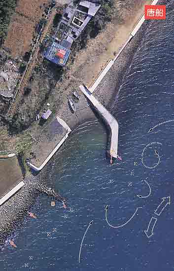 上物の釣り場は波止部だけに絞られるが、他の釣り物では投げでアイナメ、アコウ、アラカブなどがある。しかし乗っ込みチヌは案外知られていないようだ。 Aは先端部でチヌ(フカセは夜に大型が上がる)、カゴ仕掛けでクロの釣り場。多くても三名までで、カゴでクロを狙う場合、反転流もしくは潮止まり前後を狙うことが鉄則。地元勢はアミエビの水なしの物を使い、プラスチックカゴ仕掛けで、えさはサシアミを使って釣果を上げている。 投げ釣りで狙うならBがよい。置き竿でアイナメ、アラカブ、アコウ、たまにヒラメも当たる。一帯は藻と岩が入り混じっているため、ジェットテンビンなどを使うと仕掛けの損傷が少ない。岩虫エサで尺キスの一発狙いも面白い。風向きは一番よいのが東風。それ意外では釣りづらいときがある。また波止で夜釣りをするときに注意したいのが毒魚ゴンズイである。ここ周辺はかなり多いのでライトで照らして確認するように。 |