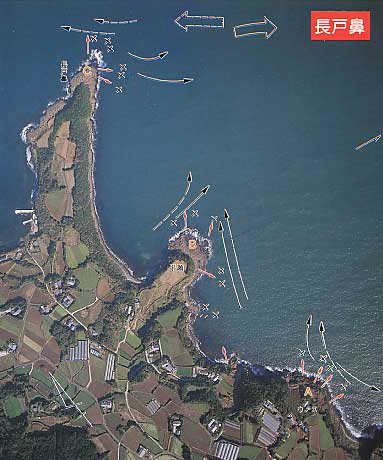 ポイントはAのウノス、Bの平瀬、Cの長戸鼻の三か所に分かれる。A、B、Cともに上げ、下げの両潮狙えるが、下げ潮の方が確率は高い。この一帯には、沖に定置網が張ってあるが、釣りにはなんら影響はない。 Aのウノスは、冬から春先にかけて、フカセ仕掛けで狙うと大型チヌが出るのがうれしい。 潮の大小によって、手前の方は流れ方が幾通りもあるのだが、上げ、下げともにやや沖に出るときがよい。数こそ出ないが、たまに良型のクロが上がることがある。しかし、ここではチヌ一本に的を絞って釣行するのがベスト。タナは一ヒロから二ヒロくらいを調節すること。 Bの平頼も狙い方は同じであるが、釣場としては収容力もあり、足場もよいので家族連れにはもってこいの釣場である。ただし東から北東の風が強い日には波がはい上がってくるので十分注意をするようにしたい。 Cの長戸鼻はフカセ釣り、カゴ釣りともに狙えるところである。チヌ、クロ、そして夜釣りでイサキが当たることもある。また1月から3月下旬のササイカ狙いも面白い。ポイントは突端左右ともに良い。 夜釣りのフカセは足下を虫エサで狙ケと、中型クロが出る。上げ、下げともに沖に出る潮を一ヒロから四ヒロくらいで狙う。 |