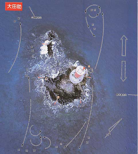 ここは昼、夜ともにカゴ釣りの人が多い。しかしフカセでも反転流の各流れをつかめばクロ、チヌの良型が期待できる。 Aの船付けコンクリートは夜のカゴ釣りでマダイ、イサキ、たまにアラの小型もあがる。上潮がよく、タナ八ヒロから一二ヒロくらいを調節してワイを狙う。 Bは下げオンリーのポイントで、平戸大橋方向へタナ四ヒロから七ヒロくらいで釣る。100mくらい流し、ワイの中へ引っ張るとポイントへ届く。大型は★印の方向へ移動して取込む。大型マダイ、チヌの魚影は濃い。 Cは小潮、長、若潮の上げ狙いのポイントで、ここも浅く遠投に分がある。マダイ、チヌ、イシダイの小型。フカセで昼、夜狙うなら2号以上の竿が望ましい。 Cに限らず他でもやれるが要領は、本流釣りのようなフカセ仕掛けがよい。北の風は各釣座とも横からになるが、何とかなる。 |