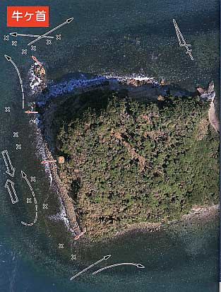 広瀬灯台を正面に見るここ牛ヶ首は、反転流を狙うことが原則だが、ここもカゴ釣りのポイントである。写真でも判るように全体的に浅い。しかし時期になればクロ、チヌ、イサキ、マダイがあがる。 Aは夜釣りのカゴ仕掛けに中型マダイ、イサキがあがる。広瀬灯台方向に行く下げの反転流が一番の潮。タナは四ヒロから八ヒロぐらいを調節し、釣遠投が必要である。エサはボイルでよいが、重量を増すために生オキアミを混ぜるとよい。5月ごろからイサキがボツボツあがる。フカセでもよいが、釣座が狭いので釣り場の確保が難しい。ここは上げ、下げ良潮とも狙えるところで、タナは一ヒロから二ヒロ半くらいを調節する。乗っ込み時のチヌは大型が望める。クロは中、小型が主体。 Bは地元の釣り人が多く、カゴ仕掛けで狙っているポイント。ここも中、小型が主体。タナは三ヒロから四ヒロくらいを調節するとよい。写真にはないが下方奥にもフカセ釣りのポイントが数カ所あるので探ってみるのも面白い。一ヒロから二ピロくらいのタナでチヌ、クロがあがる。 |