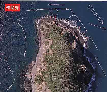 瀬渡し基地汐の浦よりすぐの磯。夜の中がたマダイ、イサキ、チヌ、バリとここも魚影は濃い。ポイントは二つに分かれるが、西側一帯と南側の出っ張り部。西側は沖のほうはかなり深く、潮の流れも速い。南側は西側と比較してみるとポイントは狭い。 Aはフカセ、カゴ釣りともによく、フカセでクロ、チヌ、バリが三ピロから五ヒロのタナで当たる。チヌの場合はもっと深くすることもある。カゴ釣りの場合はここもやはり超遠投で夜釣りのタナは八ヒロから十ピロくらいを調節して中型マダイ、イサキが両潮とも狙える。ただし北から西の風には弱いので注意すること。 Bはフカセでクロ、チヌが当たる。釣座の左斜め前のカケアガリに沿って流すとよい。タナはニピロから四ヒロを調節する。 Cはニ〜三名が適当な釣場。フカセで上礁する人が多いところであり、チヌ、クロともによく、ニピロ〜三ピロくらいを調節して釣る。冬場の北、北西風が吹いたときは絶好の場所となる。先客がいる場合は右側から竿出ししてもよい。 |