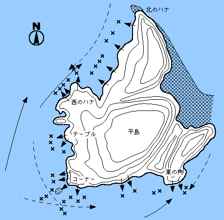 北のハナから西のハナ一帯はどこでもチヌが釣れるといってよい程である。一般的に下げ潮がよく足元から竿1本前後で釣る。西のハナは上げ潮に分がある。ここも全体がポイントといってよい。テーブルは釣りやすく、夜釣りのチヌ、マダイがおもしろい。コーナーは下げ潮に乗せて流せば大型が釣れる。かなり沖目で釣れることもある。夜釣りにはイサキ、マダイも釣れる。東の角には水深があり竿2本以上のタナをとって下げ潮を釣る。2キロ以上の良型チヌが釣れる。夜釣りのマダイもおもしろい。