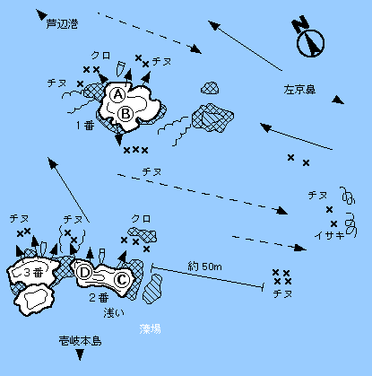 チヌに関しては壱岐東部随一の実績。1番はA点で両潮やれ、張り出した沈み瀬の際でチヌ、クロが釣れる。両潮共ちょうどよい早さで潮が流れ釣りやすい。B点は下げのポイント。チヌがよい。クロは小型。沖の沈みで波がふくれるので注意すること。ウキ下は竿1本前後。