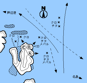 北西及び西の風には強いが、東が吹くとなかなか上礁できない。全体的に浅く、ここもチヌのポイント。チヌの魚影は濃く、特に春先から必ずといっていい程釣れるが、型は小さい。おもしろいのはメバルで25cm以上の大型が20匹前後釣れることもある。