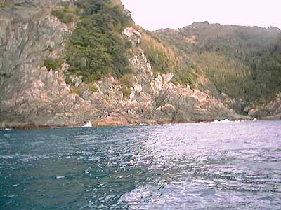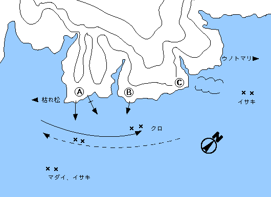 ポイントは3ヶ所。Aは底物ポイントとしても有名。下げは枯れ松方面へ流れる潮を足元から探る。イサキ、クロ。Bも大体同じだが、冬季は足元から深いので竿2本近く水深をとって目の前を攻める方がよい。クロは40cmオーバーも混じる。Cのポイントは遠投ぎみがよく、秋冬のイサキの好ポイントでもある。