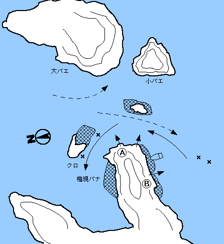 小バエとの水道は激流が走るので、満ち潮は全般に釣り辛い。ポイントAは瀬際ねらいか、もしくは下げ潮を狙う。突端から満ち潮にのせてワンドの大きなゴロタ石へ仕掛けを流し込み、大型のクロを抜き上げるベテランもいる。ポイントBは満ちでは瀬際を、下げでは右側前方へ流れる潮に乗せる。カゴ遠投で下げ潮を狙うと、マダイ、イサキ。ここのマダイは大型も当たるので、そのつもりで準備すること。