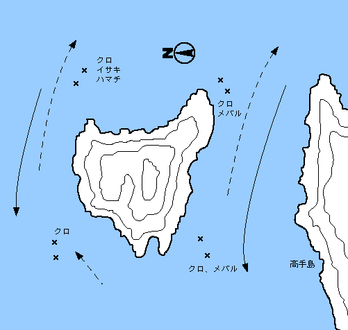 足場が悪いのが欠点だが、特に青物、マダイ、イサキは数、型がでるポイントである。これらを狙うにはやはり、カゴ釣りに分がある。フカセでは本流の引かれ潮をねらい、クロがでる。沖側では下げ潮がよい。水道の上潮は足元から仕掛けを送り込む。クロ、イサキ、メバルがよい。