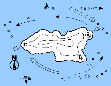 瀬は高く大きいが、足場はよくない。両脇の水道からくる潮の合流点をていねいに釣ること。特にA点は下げがよく、潮が早いので、やや重めの仕掛けを作り、潮目にマキエと仕掛けを流し込むと、クロ、イサキ、ヤズがヒットする。AとBにわかれてそれぞれ一人がいい。反対に上潮時は裏側のCから釣る。中型のクロの数釣りが期待できる。潮の合流点あたりまで流すと、よい釣りができる。