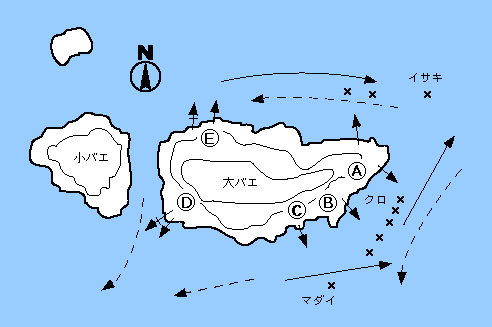 鶴見大島ではNO.1の名礁。ポイントAは両潮やれる。上物ならほとんどの対象魚が狙える。B、Cはサラシの中から沈み瀬の周辺を探る。とくにA、B、Cは波が膨れるので注意すること。Dは下げのポイント。底物もいける。Eは上潮ねらいがよい。イシダイのポイントもある。また,上潮時にはAの大島向きもよく,引かれ潮を攻めると、数は出ないが大型のクロが釣れる。