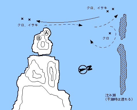 周辺に沈み瀬が多く、魚の数も多い。Aポイントはダンバナ方向へ流れる潮をねらう。クロ、イサキ、マダイ。大きな沈み瀬が横たわるが、その近辺で当たることが多い。Bポイントはその逆を狙い、左沖へ出る潮にのせる。竿2本ほどのタナでカゴ釣りするのもよい。イサキ、マダイのほか、型のよいクロやヤズも釣れる。案外足場もよく釣りやすい場所でもある。