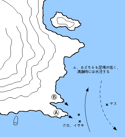 Aポイントはここの本命だが、大潮の満潮では水没するので、注意を要する。瀬際からマキエと合わせながら沖の本流とのカベをねらう釣りがユーレイの基本攻略法だ。クロの魚影は濃く、良型も混じる。春はチヌも多い。BはAの予備ポイントで、ここもオーソドックスなフカセ釣りでよい。