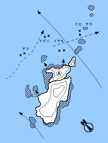 宇戸島に連なるハナレ瀬で通称センスイカンと呼ばれている。目前に元の間海峡をひかえ潮通しが抜群によい。特にチヌ、マダイはよく釣れる。下げ潮が有利でA点から沖へ流れる潮に仕掛けを乗せる。水深は竿1本程度だが、沖に向かい沈みがたくさんあり、この周辺でチヌ、クロが当たる。カゴ仕掛けではマダイ、イサキがいい。春から晩秋にかけてがベストシーズンだ。