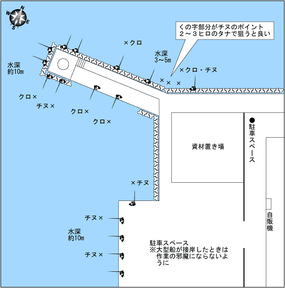 チヌ、クロ共に狙え、春の乗っ込み時期には50cmオーバーの大チヌが釣れている。クロは手のひら〜足の裏サイズが中心だが、まづめ時には30〜35cm級も狙える所。