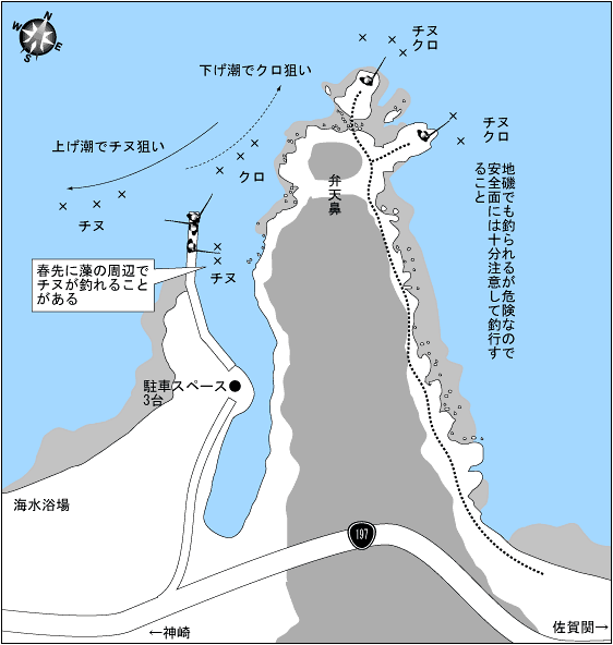 20〜30m先に遠投しても水深がサオ1本ほどしかなく、全体的に浅いのが特徴だ。チヌを狙う場合、根掛かり覚悟でタナをサオ1本〜1本半に設定し、クロについては2〜3ヒロで実績が高い。