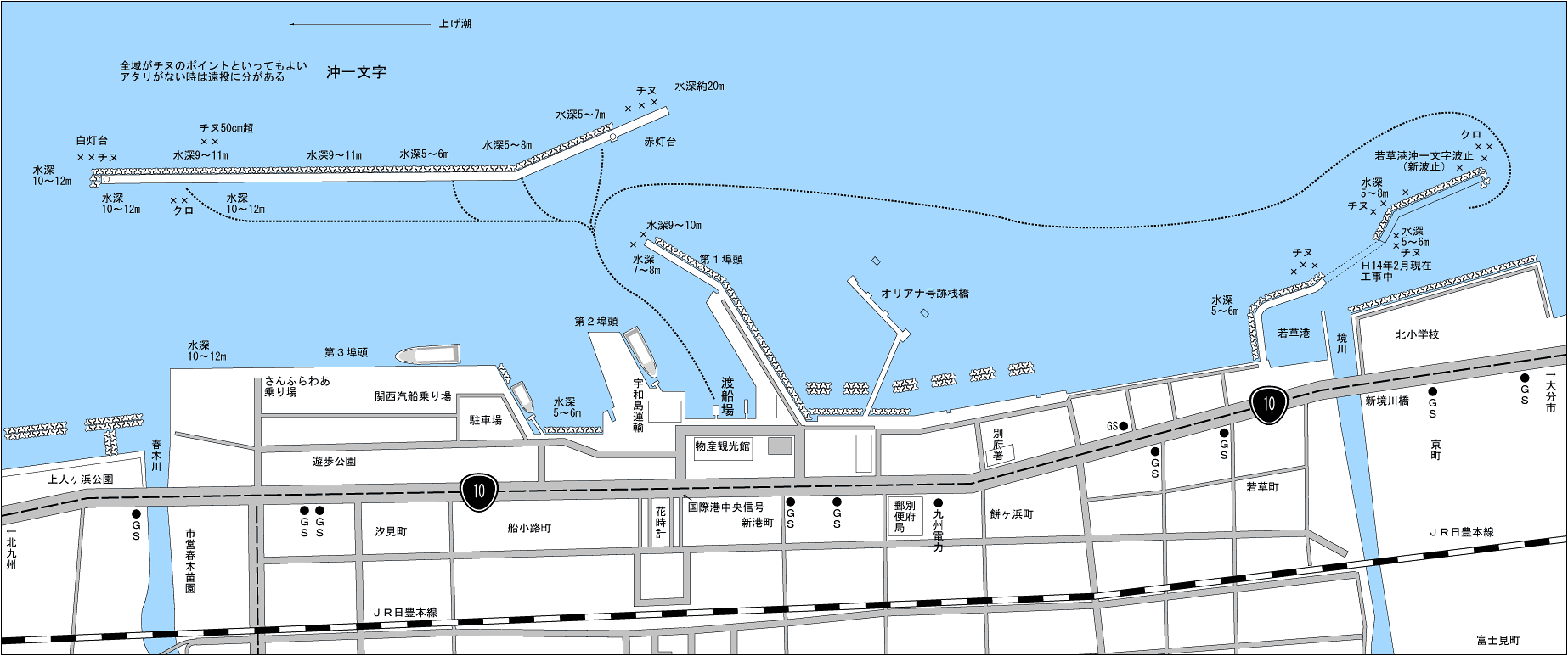 クロも30cmクラスまで狙え、梅雨時期には湧きグロを目撃することもできる。なお、H14.3月現在は工事中だが若草港の波止とつながる予定。