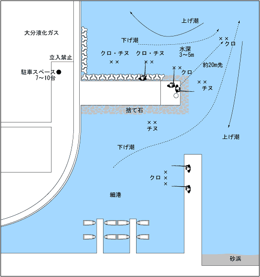 日吉原公共埠頭の佐賀関側に位置している小さな波止で、足場が良くメイタの数釣りができることでも人気がある釣場。夏場はエサ盗りが多いのでチヌ狙いは夜釣り。日中のクロ釣りも手前側はエサ盗りの群れ(小アジ・フグなど)が支配しているのでマキエ、ツケエ共にパン粉を使用して20〜30m沖の下げ潮を狙うようにすると30cmクラスのクロが釣れる。