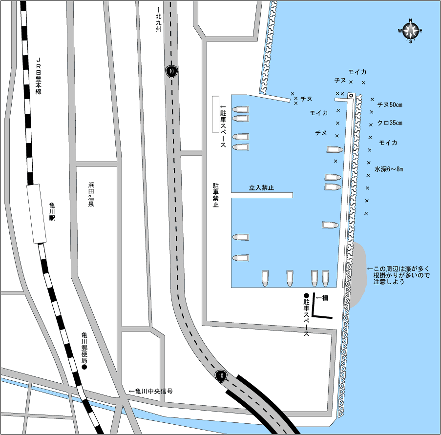 クロは外向きのテトラ全体で狙えるが、大型は中間から先端に掛けて実績が高いようだ。チヌのポイントは外向き、港内のどちらも実績が高い。