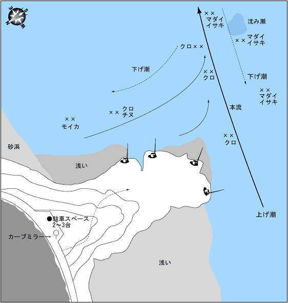 本命潮は上げ潮で本流が流れるので、それに仕掛けを流しながら釣ってもよいが、足下からの引かれ潮が本流と合流するポイントでクロのヒットする確率が高い。