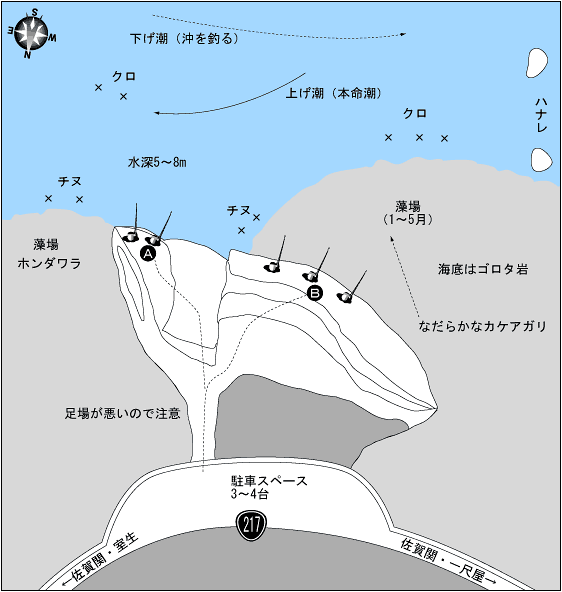 冬場の北西風に強い釣場。右に行くほど浅くB地点正面の水深は3〜5m程。海底には根の太い海藻が多いため根掛かりに注意。潮は釣座A点の先端をかすめ蔦島方向へ流れる上げ潮が良い。4〜5月の乗っ込み期に良型のチヌがよく釣れる。ポイントは左にある藻の際と潮筋で、潮筋を狙う場合は潮下へ30m程流す。