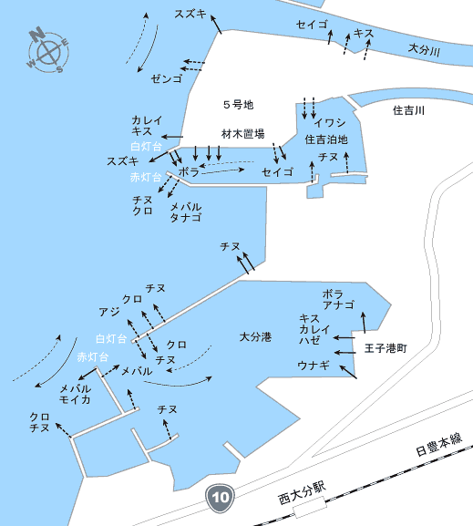 西大分駅前の大分港は、赤・白の両灯台とも先端から外向き内向きでクロとチヌが可能。メバルとモイカも楽しめる。 住吉泊地全体が落とし込みでチヌが狙えるほか、白灯台付近が秋のタチウオのポイントとなる。ここはチヌ・クロ・アジ・キス・カレイ・スズキと最高の場所だ。 外側のテトラでは12月〜3月にかけてメバルの数釣りが楽しめる。 5号地は材木置き場周辺が好ポイントだが、荷役のジャマにならないよう注意したい。 |
