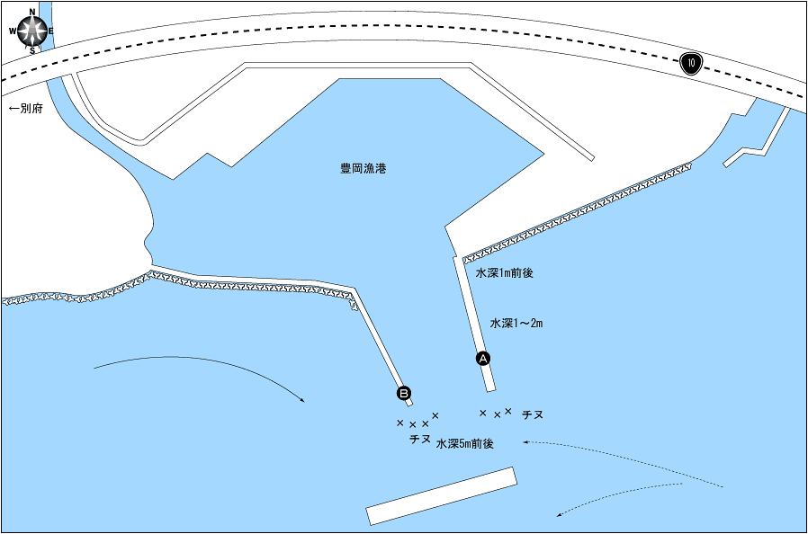 の波止の外向きは1〜2mほどで釣りにならないため、釣座は波止先端に限られる。