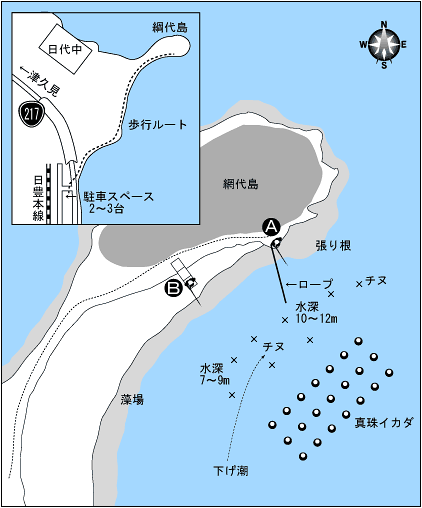網代島は干潮時のみ陸行できるポイント。釣座は南向きの岩場A地点とケーソンのB地点からとなるため冬場の北西風に強く、潮の流れも緩やかなため寒チヌ狙いには最適。また1〜5月の間は良型のメバルも狙える。