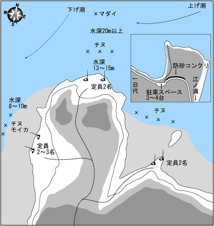釣場手前にある峠から釣座を確認できるので、一度確認してから行く。この海域は沖に浮かぶ養殖イカダの影響かもしれないが、年間を通じてアジの回遊が多く、オキアミのみのツケエでは太刀打ちできないため、数種類のツケエを用意して臨みたい。