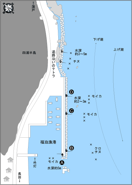 魚種も豊富で魚影も濃い釣場。Aで夏の半夜釣りにスズキ、セイゴがゼンゴの泳がせ釣りで釣れる。Bの釣座はクロ、チヌ、バリがよい。C、Dはモイカ、バリ。水深は先端部で5m、波止の根元で2〜3m。潮通しもよく、大潮回りに実績が高い。