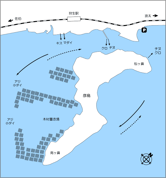 狩生駅前の埋め立てグラウンドからキス・チヌ・小ダイが釣れるほか、たまにコチも当たってくる。